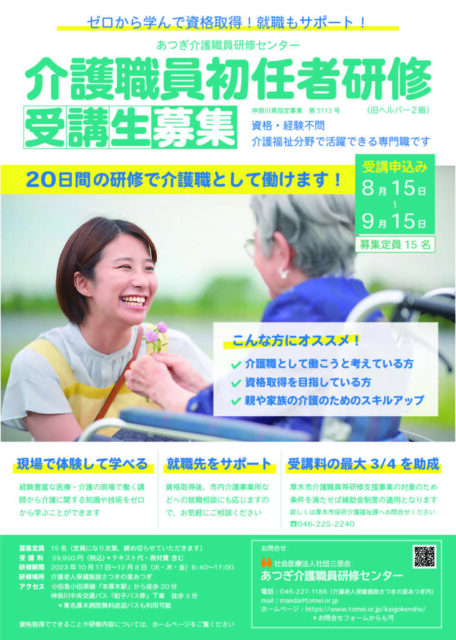あつぎ介護職員研修センター(介護老人保健施設 さつきの里あつぎ内)では、介護職員初任者研修の受講生を募集します。