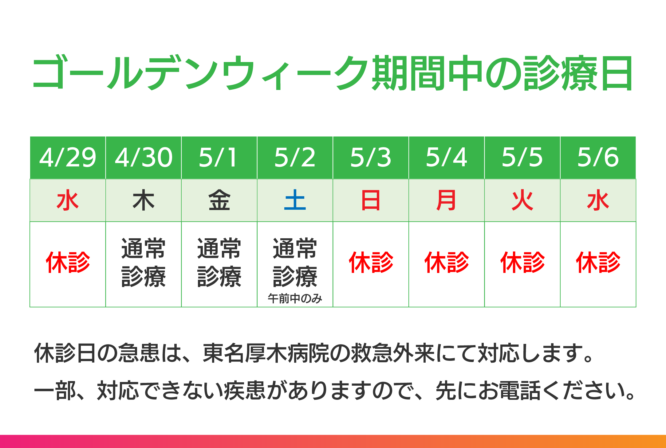 休診日の急患対応は、東名厚木病院の外来にて対応いたします。
