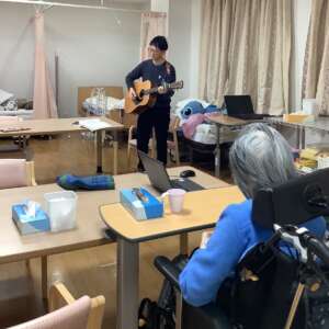 「瀬戸の花嫁」や「学生時代」など数曲を聴きながら、サ高住の方々と共に歌い、