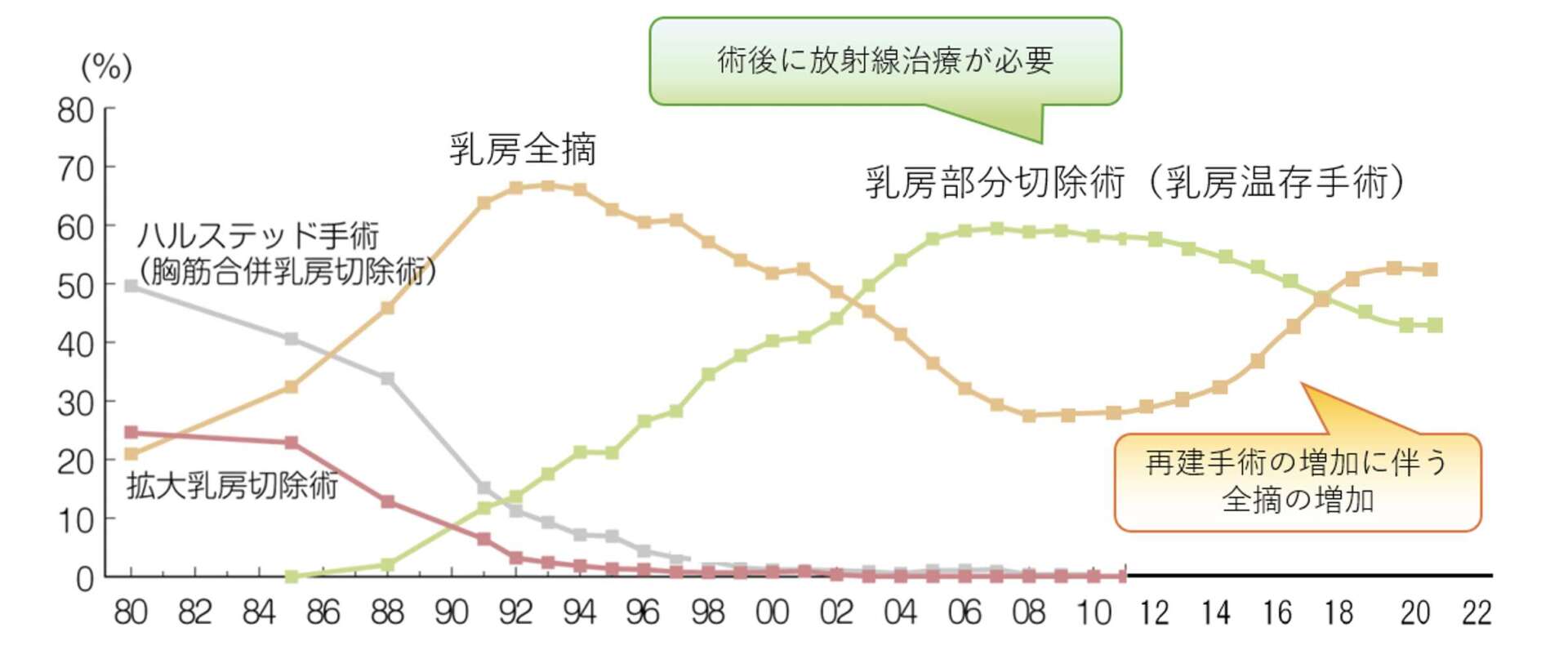 参考:福田護, 乳癌手術における根治性と整容性の変遷: Oncoplastic Breast Surgery4, 79-83, 2019 乳癌学会の調査と福田護先生の論文のグラフを参考に著者作成