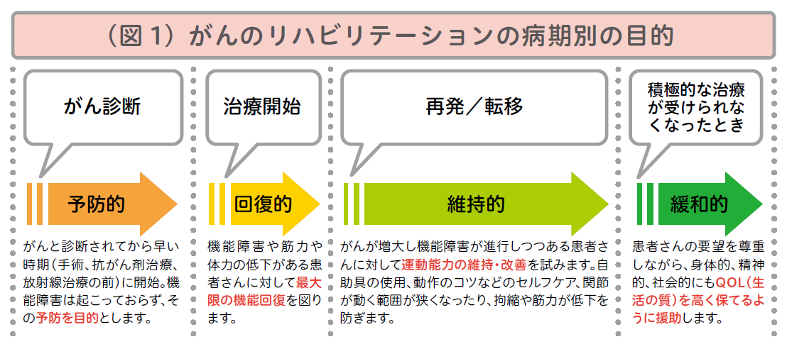 がんのリハビリテーションは診断直後から始める「予防的リハビリテーション」、治療と並行して受ける「回復的リハビリテーション」、再発/転移の時期には「維持的リハビリテーション」、症状緩和を中心とした医療が行われる「緩和的リハビリテーション」と治療の時期に応じて、リハビリテーションの目的や役割が異なります。