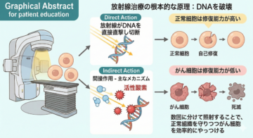 放射線治療の根本的な原理は、細胞の設計図であるDNAを破壊することにあります。 放射線が細胞内のDNAを直接攻撃し切断することを直接作用といいます。それに対して細胞内の水分と放射線が反応して「活性酸素」が発生し、その活性酸素がDNAを攻撃することを間接作用といいます。実際の放射線治療は主に間接作用によってDNAにダメージを与えます。DNAが激しく損傷すると、細胞は分裂して増えることができなくなり、やがて死滅します。ここで重要なのが、「がん細胞は正常細胞よりもダメージの修復能力が低い」という点です。正常細胞も一時的にダメージを受けますが、一定時間が経過すると自己修復します。この修復能力の差を利用して、数回に分けて照射することで、正常組織を守りつつがん細胞だけを効率的にやっつけることができるのです。