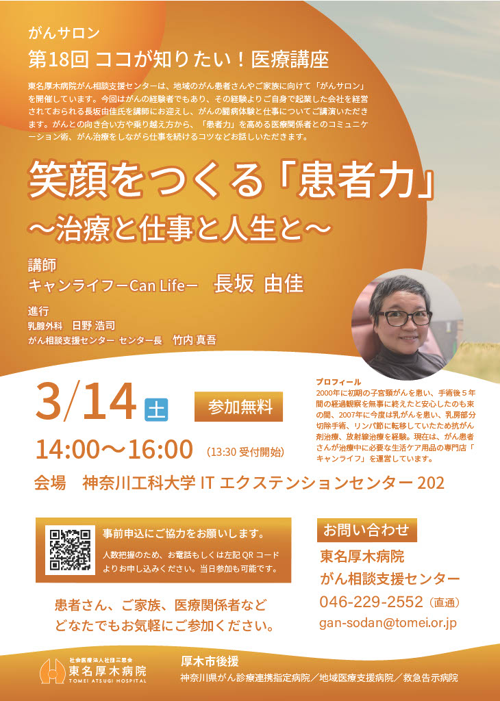 がんの経験者であり、その経験よりご自身で企業した会社を経営しておられる長坂由佳氏を講師にお迎えし、がんとの向き合い方や「患者力」を高める医療関係者とのコミュニケーション術、がん治療をしながら仕事を続けるコツなどをお話しいただきます。