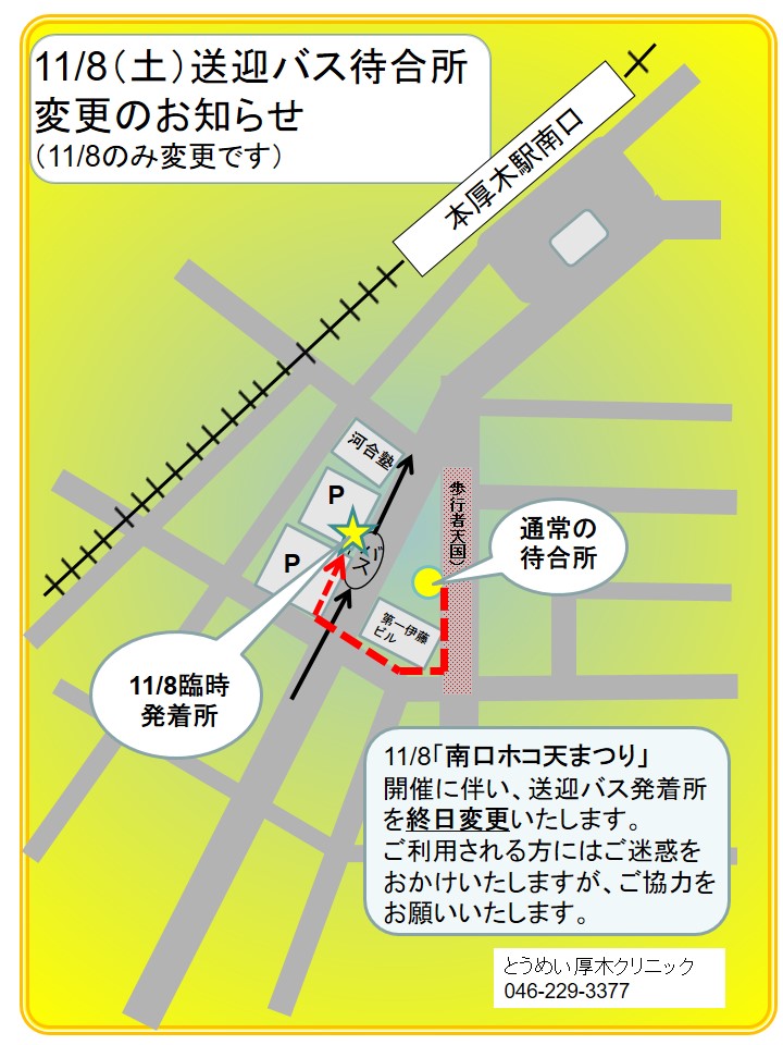 病院 本厚木駅南口ホコ天まつりによる送迎バス停留所変更のお知らせ 2025年11月7日 11月8日(土)本厚木駅南口ホコ天まつりの開催に伴い終日送迎バスの停留所が変更になります。 お間違いのないよう、よろしくお願い致します。 前の記事