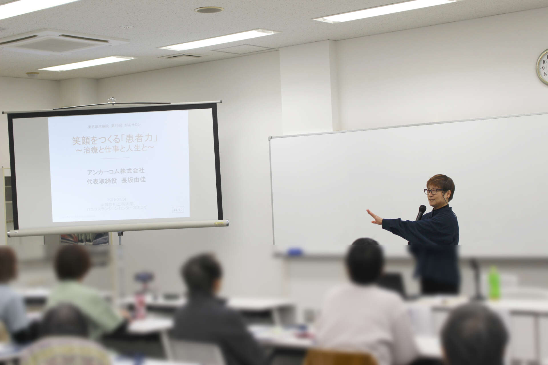2026年3月14日、神奈川工科大学ITエクステンションセンターにて、がん経験者の長坂さんを講師にお迎えし、講演会を開催しました。